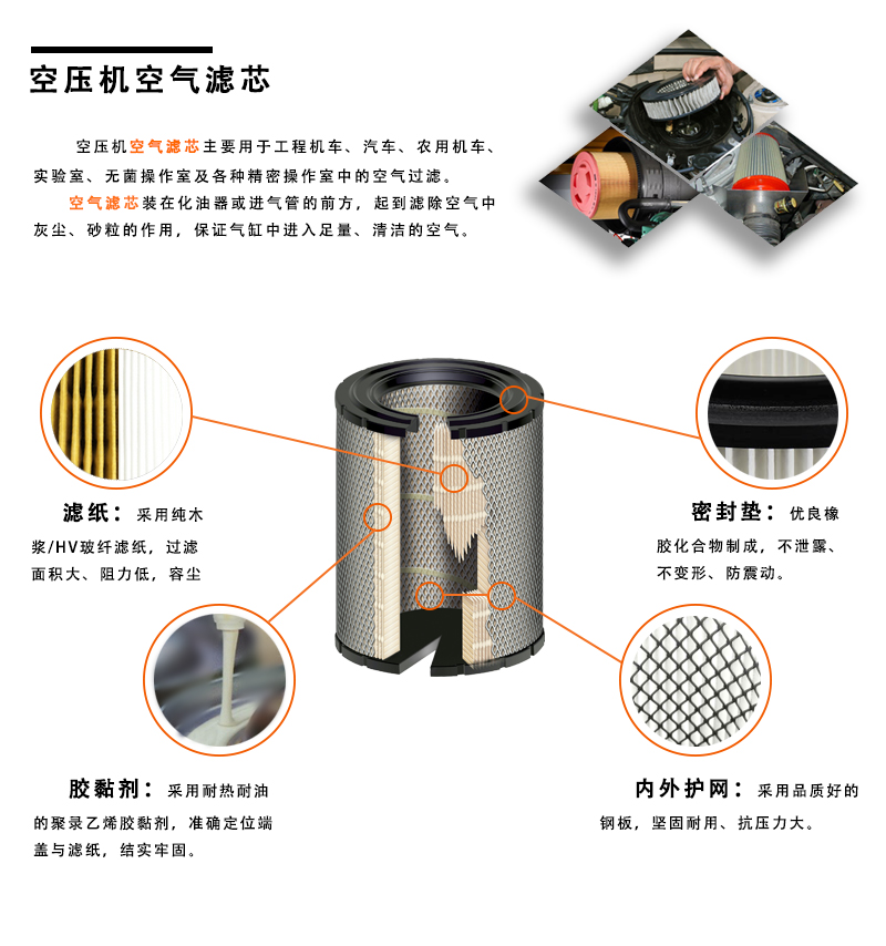 4、結(jié)構(gòu):空氣濾芯有一頭通或中通的區(qū)分,過濾精度是5-10微米,濾層的摺疊層數(shù)不能太稀疏,摺疊層數(shù)過少,會影響到過濾精度。