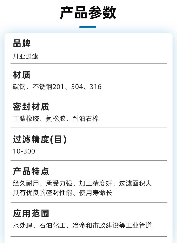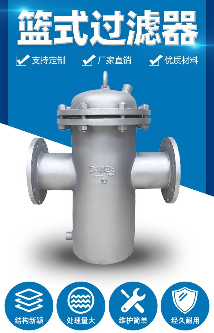 產(chǎn)品描述:籃式過濾器(basket filter)用于油或其它液體管道上,過濾管道里的雜物,過濾孔面積比通徑管面積大于2-3倍,遠遠超過Y型、T型過濾器過濾面積。過濾器精度在過濾器中屬于一種精度很好的過濾器,濾網(wǎng)結(jié)構(gòu)與其它過濾網(wǎng)不一樣,因形狀像籃子,...